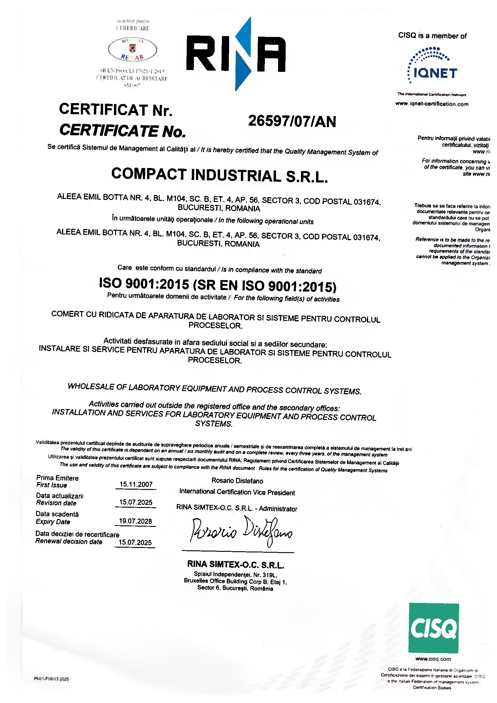 Compact Industrial este denumirea comerciala a SC Compact Industrial SRL, persoana juridica de nationalitate romana, avand sediul social in Bucuresti, Al. Emil Botta nr. 4, bl. M104, sc. 2, ap. 56, Sector 3, Bucuresti, cu numar de ordine in Registrul Comertului J40/7547/1991, cod unic de inregistrare fiscala RO1554276 (in continuare “Compact Industrial” sau “www.compact-industrial.ro“ sau “noi“). In sensul legislatiei cu privire la protectia datelor, avem calitate de operator atunci cand prelucram datele dvs cu caracter personal.